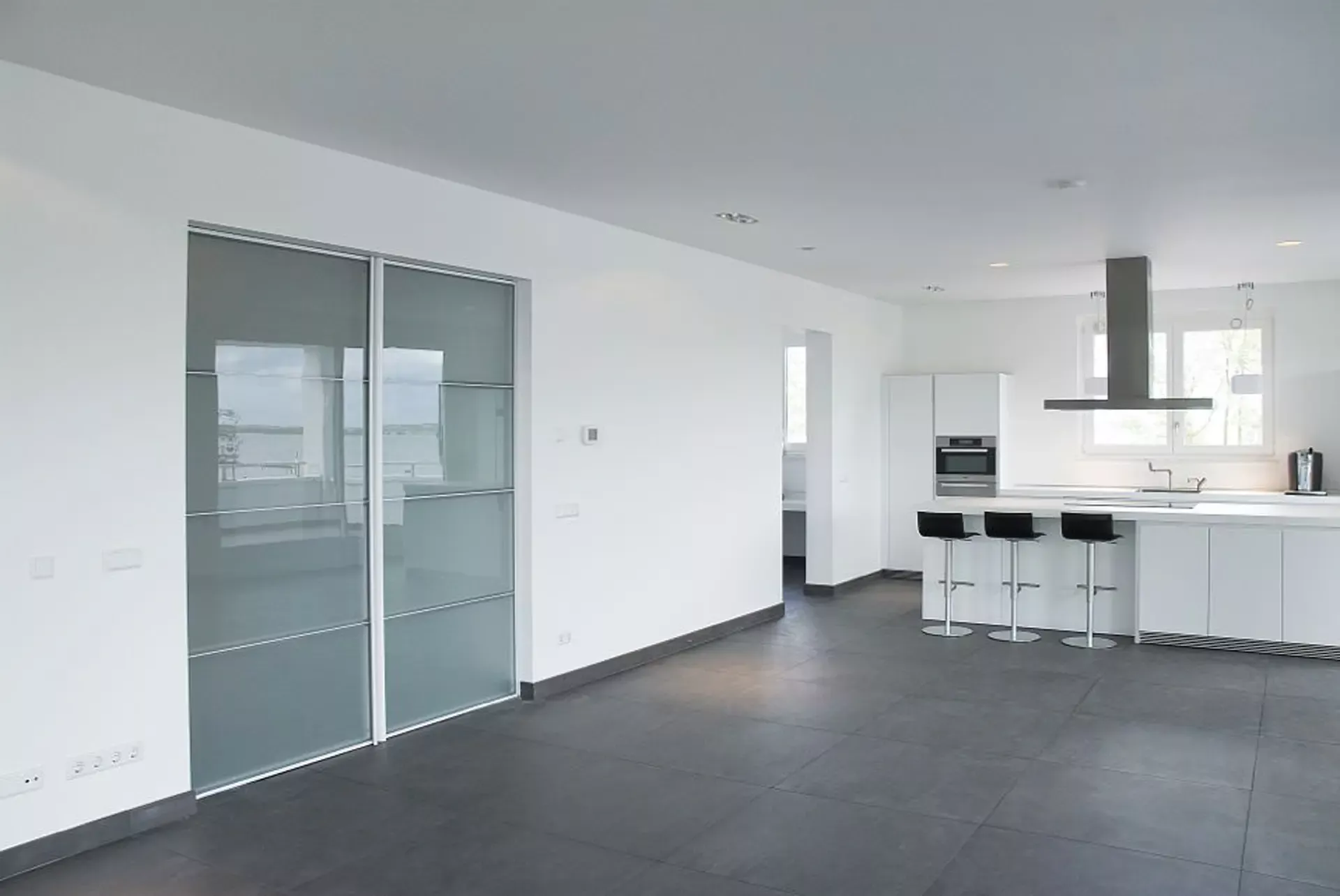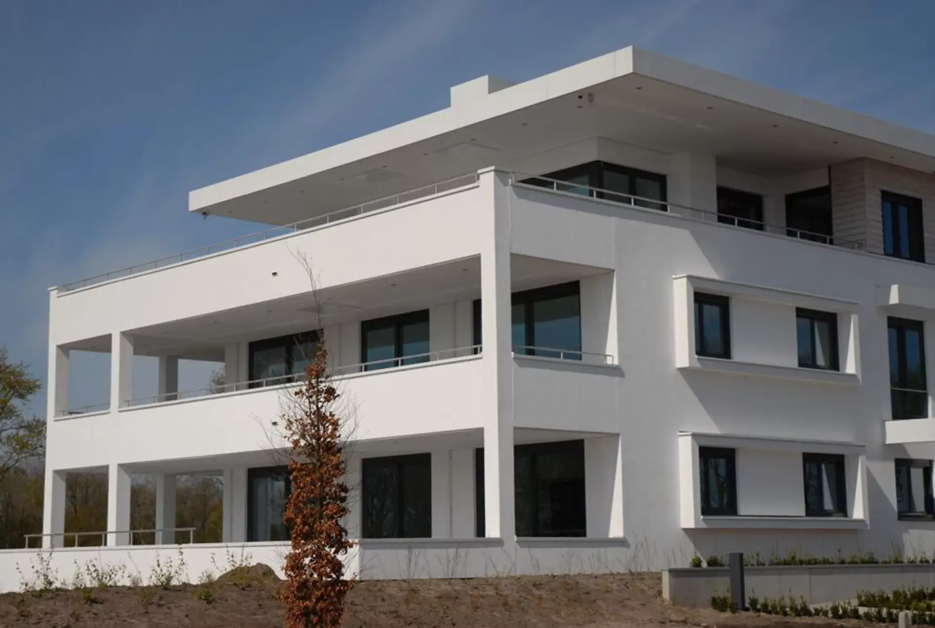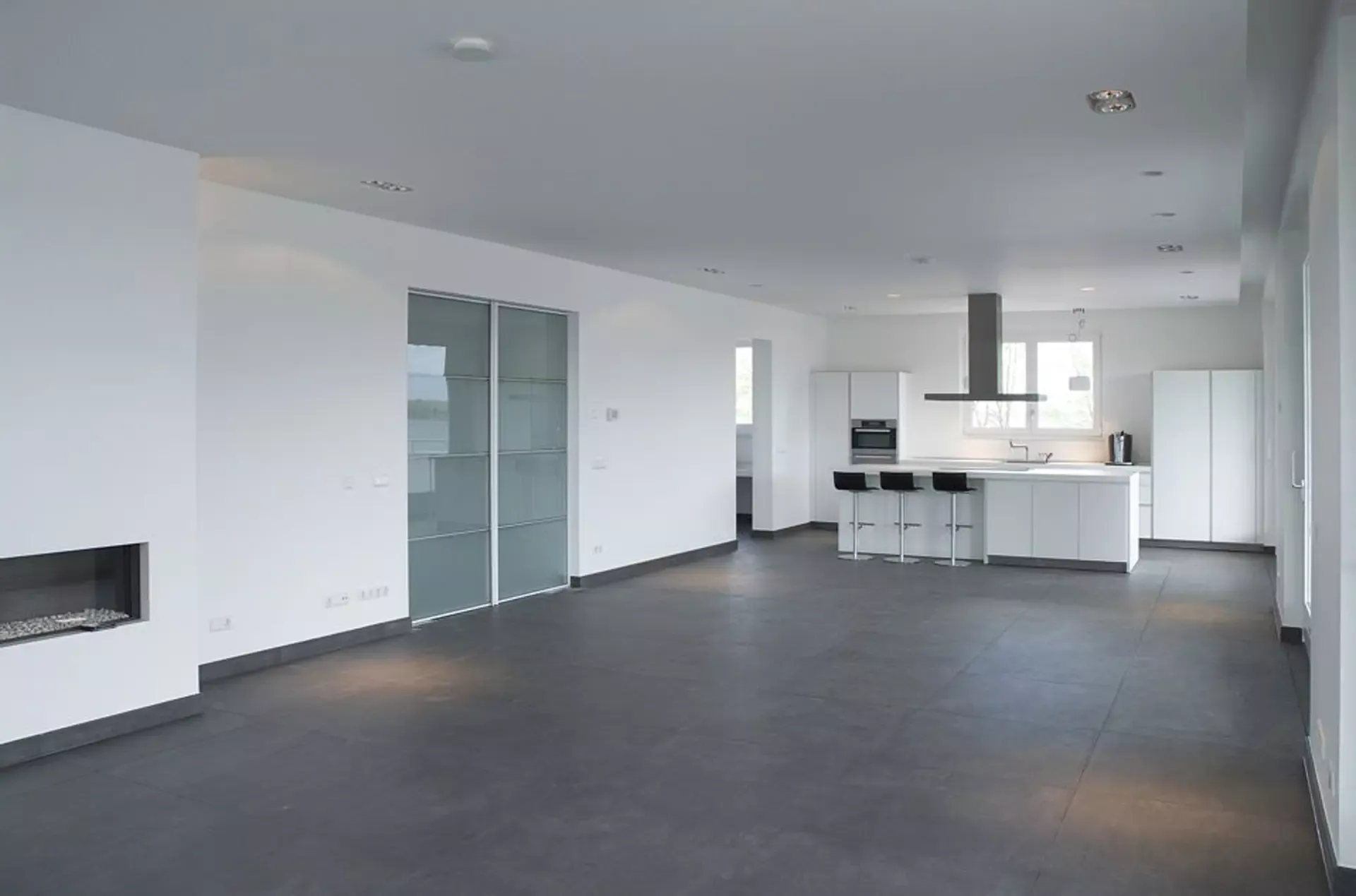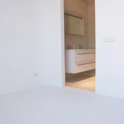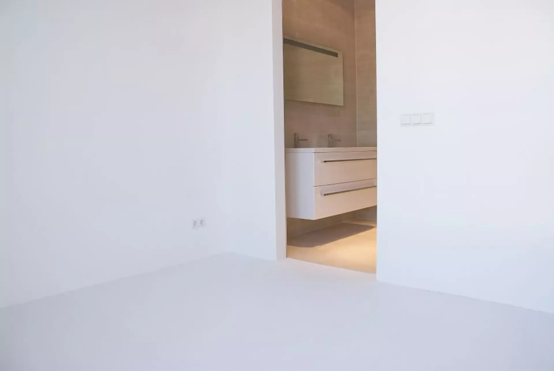 De onderstaande foto's tonen het interieur van een van de villa-appartementen. Nadat de inbouwverlichting en andere installaties waren geplaatst, hebben wij alle wanden en plafonds gestukadoord en gespoten in Jan des Bouvrie-wit, met een buitenverfkwaliteit voor extra duurzaamheid. Het houtwerk, dat oorspronkelijk donkergrijs was, hebben we gespoten in zijdeglans wit, wat zorgt voor een frisse en moderne uitstraling.