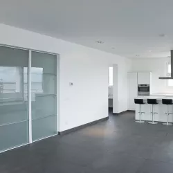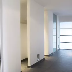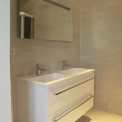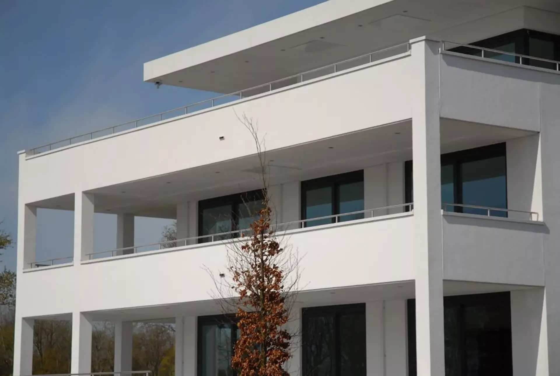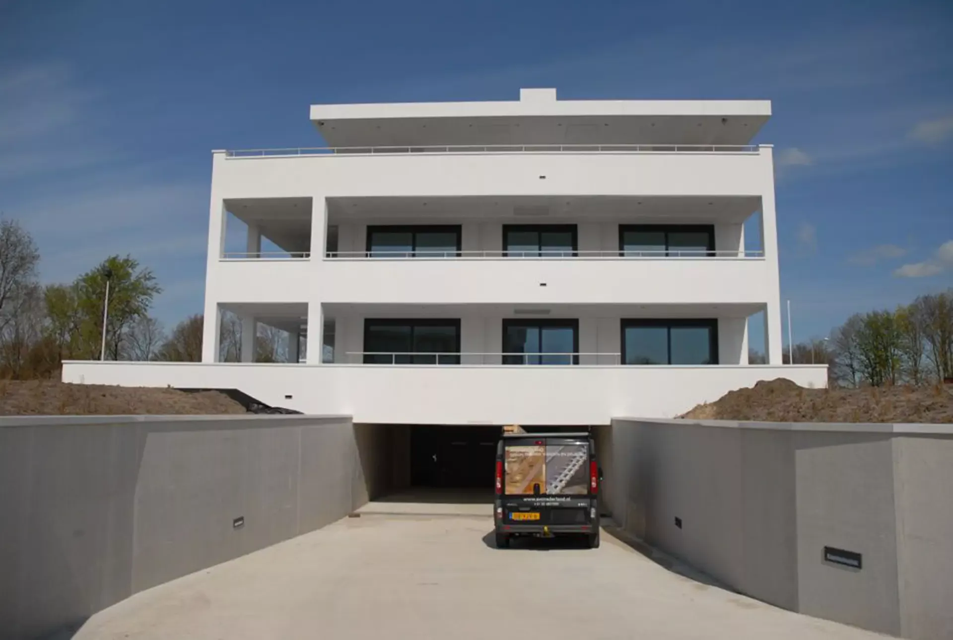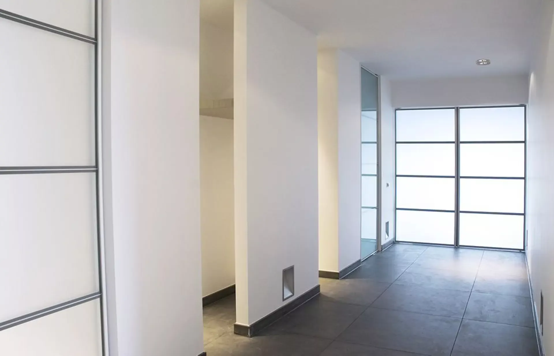 De onderstaande foto's tonen het interieur van een van de villa-appartementen. Nadat de inbouwverlichting en andere installaties waren geplaatst, hebben wij alle wanden en plafonds gestukadoord en gespoten in Jan des Bouvrie-wit, met een buitenverfkwaliteit voor extra duurzaamheid. Het houtwerk, dat oorspronkelijk donkergrijs was, hebben we gespoten in zijdeglans wit, wat zorgt voor een frisse en moderne uitstraling.