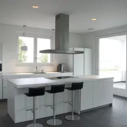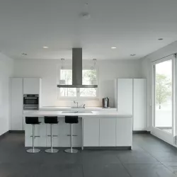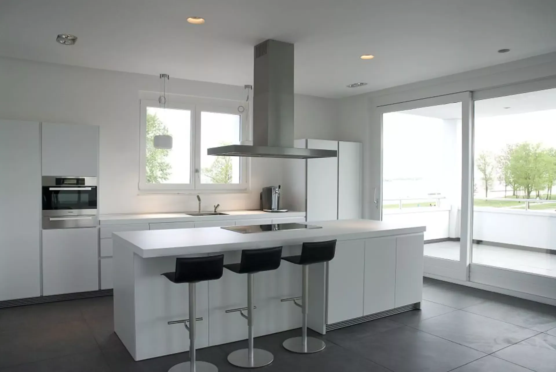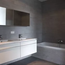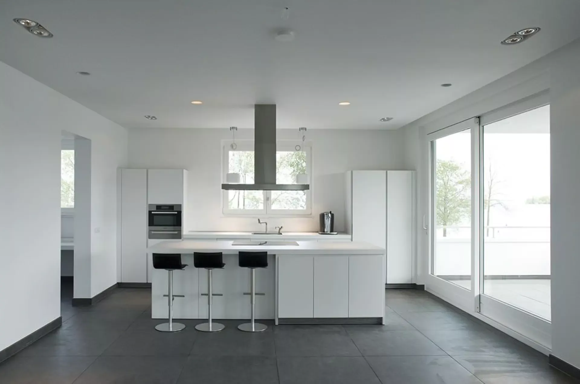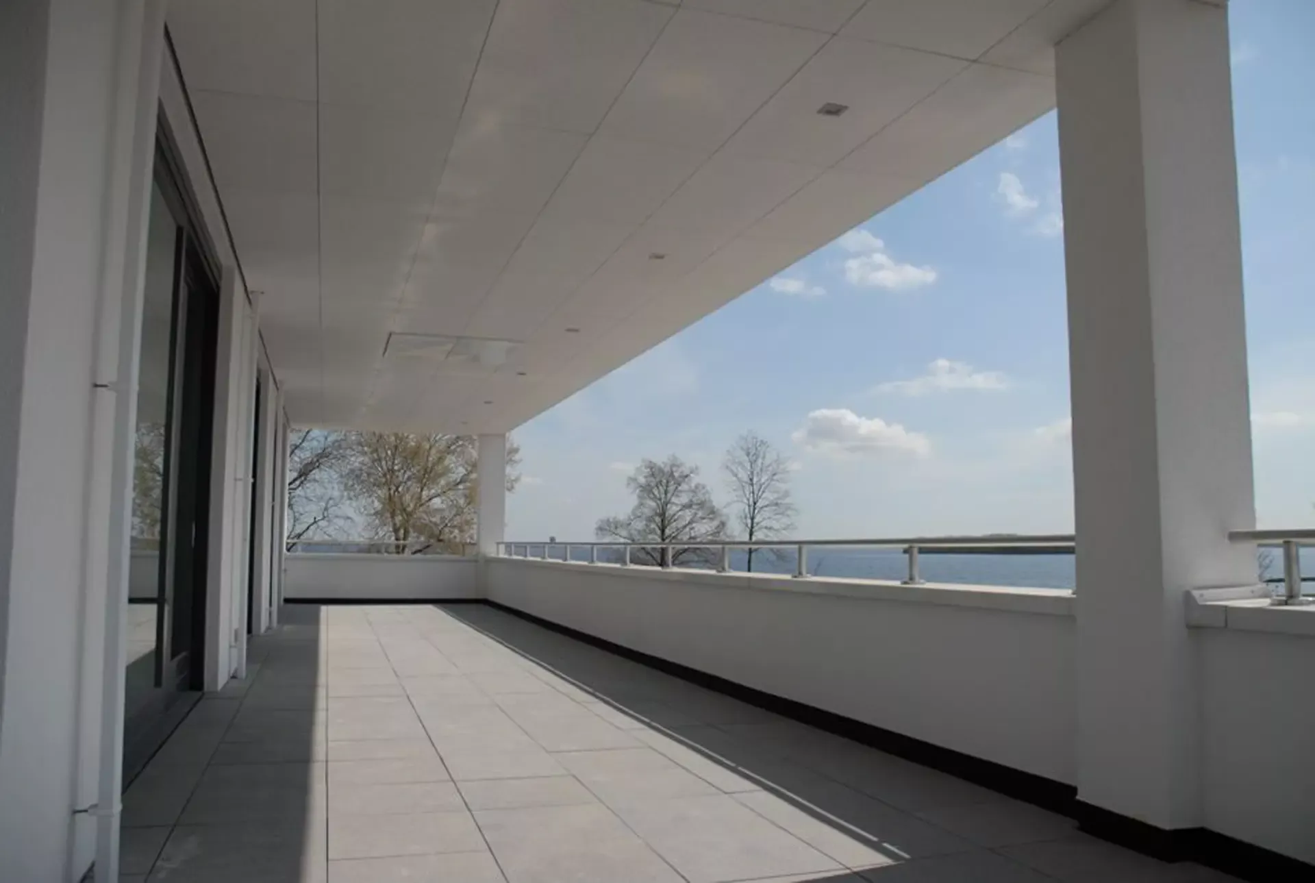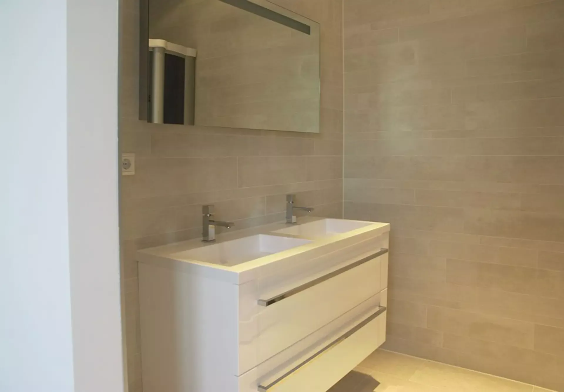 De onderstaande foto's tonen het interieur van een van de villa-appartementen. Nadat de inbouwverlichting en andere installaties waren geplaatst, hebben wij alle wanden en plafonds gestukadoord en gespoten in Jan des Bouvrie-wit, met een buitenverfkwaliteit voor extra duurzaamheid. Het houtwerk, dat oorspronkelijk donkergrijs was, hebben we gespoten in zijdeglans wit, wat zorgt voor een frisse en moderne uitstraling.